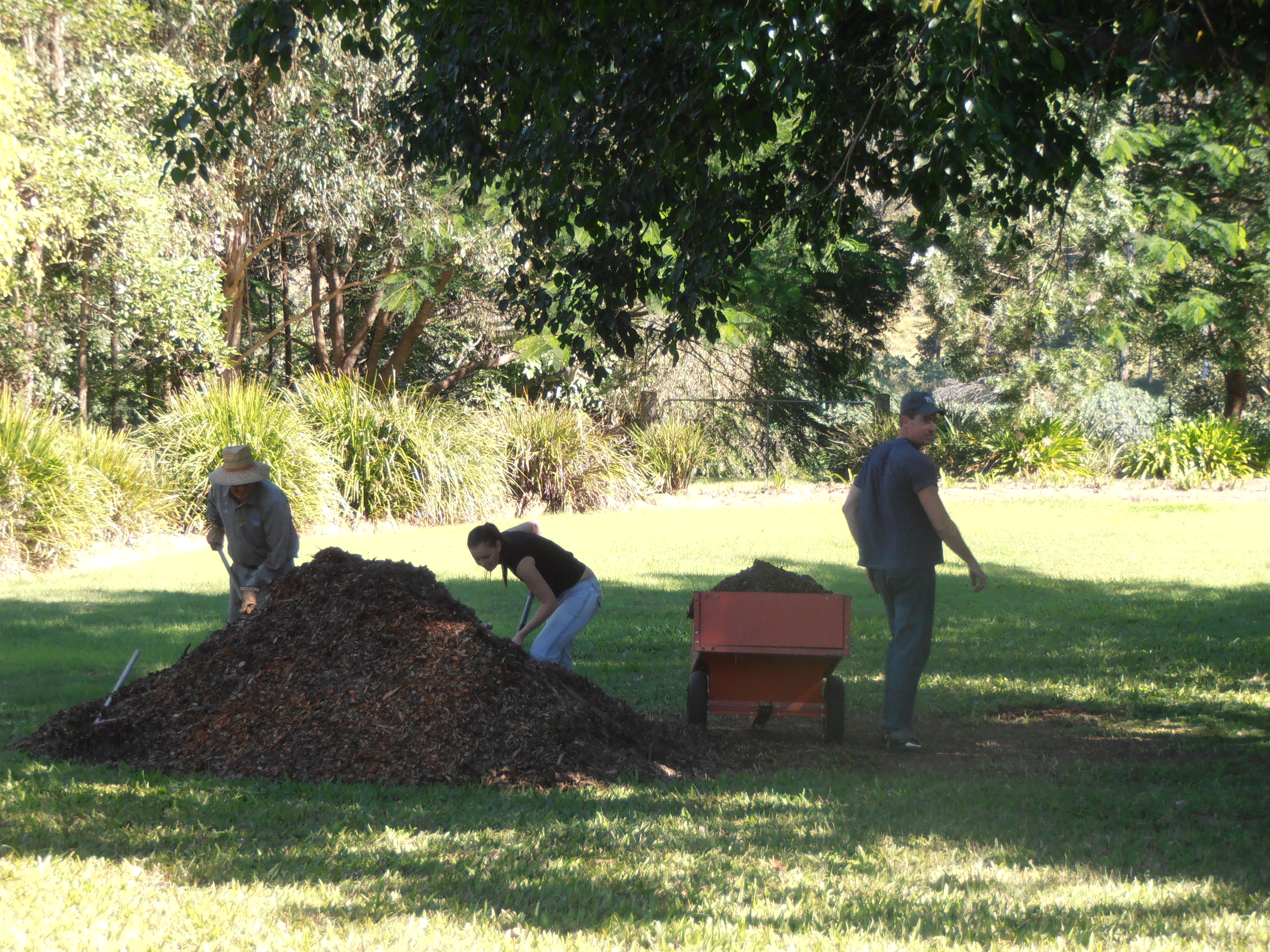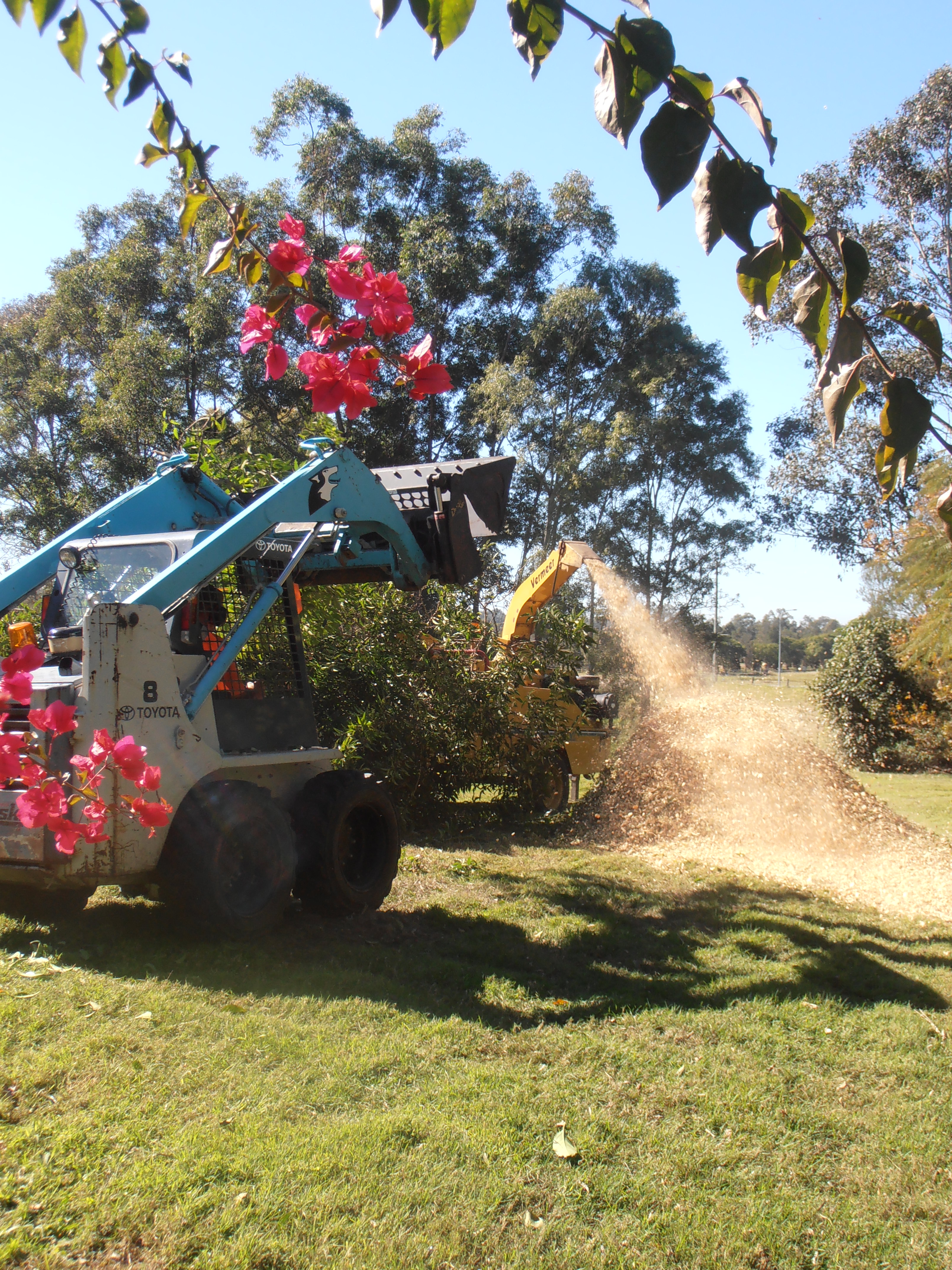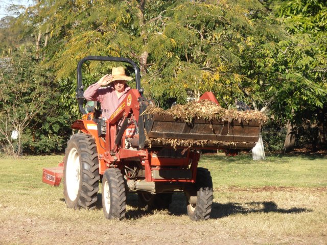 I’m pretty sure that I have read the heading for this post somewhere else…but it really does apply to Ian’s attitude. When it comes to gardening, nothing makes Ian as happy as spreading mulch around plants. This time he arranged for a professional arborist to cut down and turn into mulch: 16 Cadaghis, 2 Broad-leaf Pepper trees, an Umbrella tree and 4 scrappy trees. This amounted to 6 seriously-big piles of mulch. He did a few piles by hand with the wheelbarrow but he was especially happy to borrow a tractor from a neighbour to relocate some of the mulch onto the northern slope.