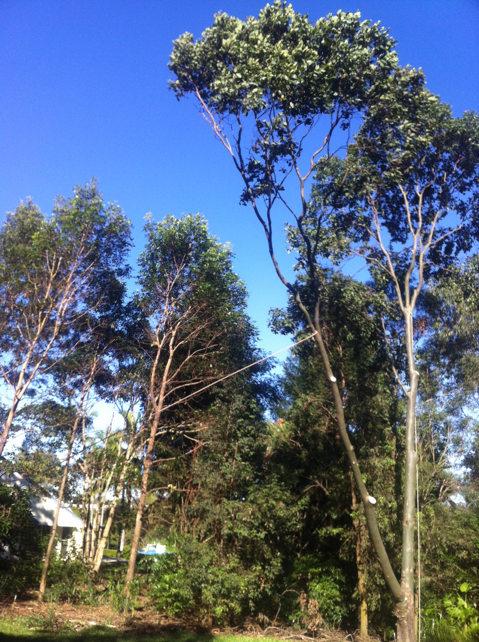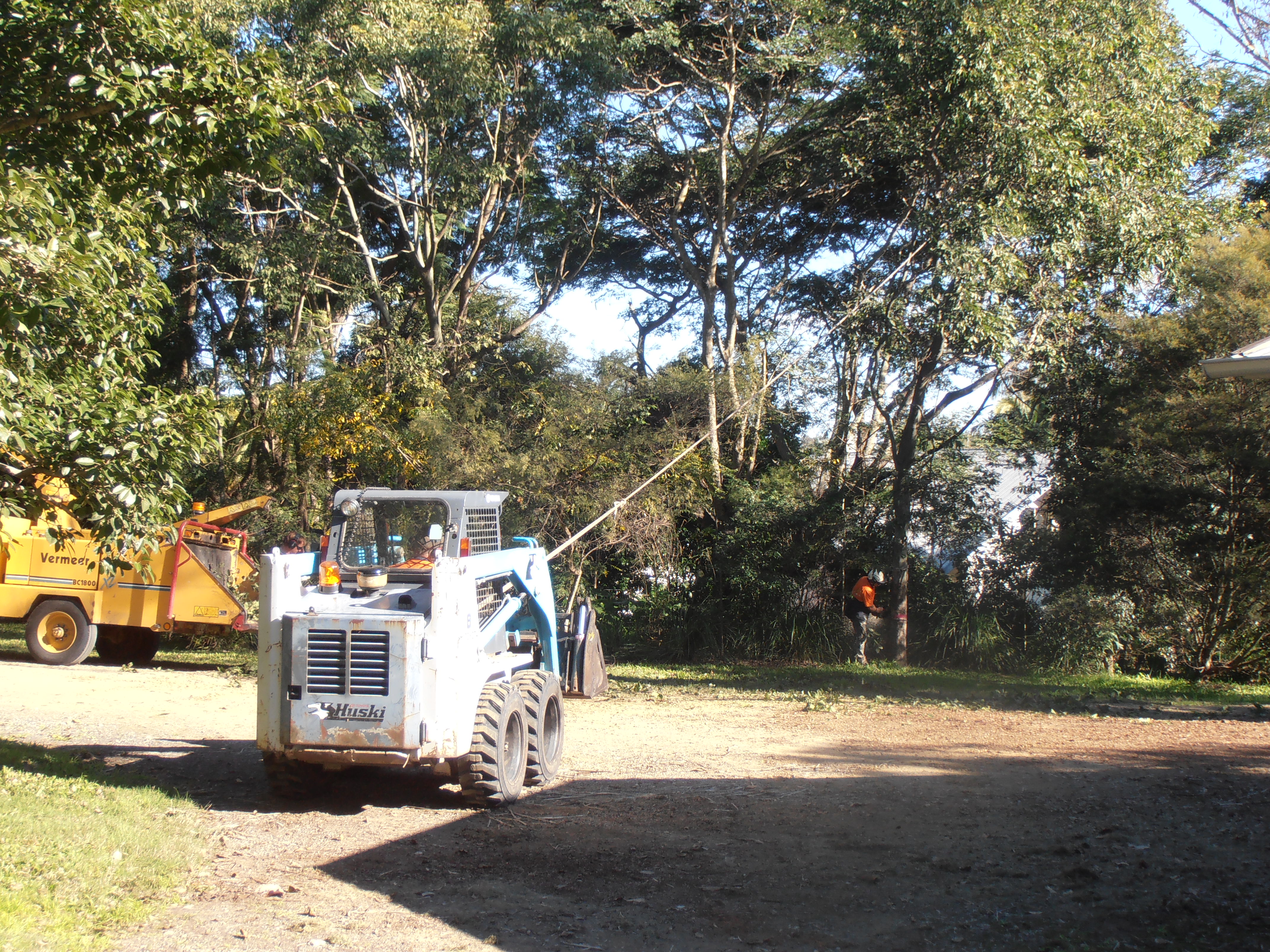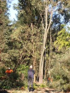 The following photos give an indication of the job that was done – in case you are thinking of becoming a tree-lopper/mulcher be aware that the branches can be very heavy, the noise can be deafening and the dusty clouds of finely-mulched vegetation can be very thick. It is a physically demanding job and climbing to the topmost branches is not for the faint-hearted – I am glad I was only a bystander. Even though it cost quite a lot of money it has been very worthwhile and we are already planting other natives to replace what we have cut down – a Kauri Pine and a Daintree Pine in Danny’s garden, and several Eucalyptus Majors in the side paddock.