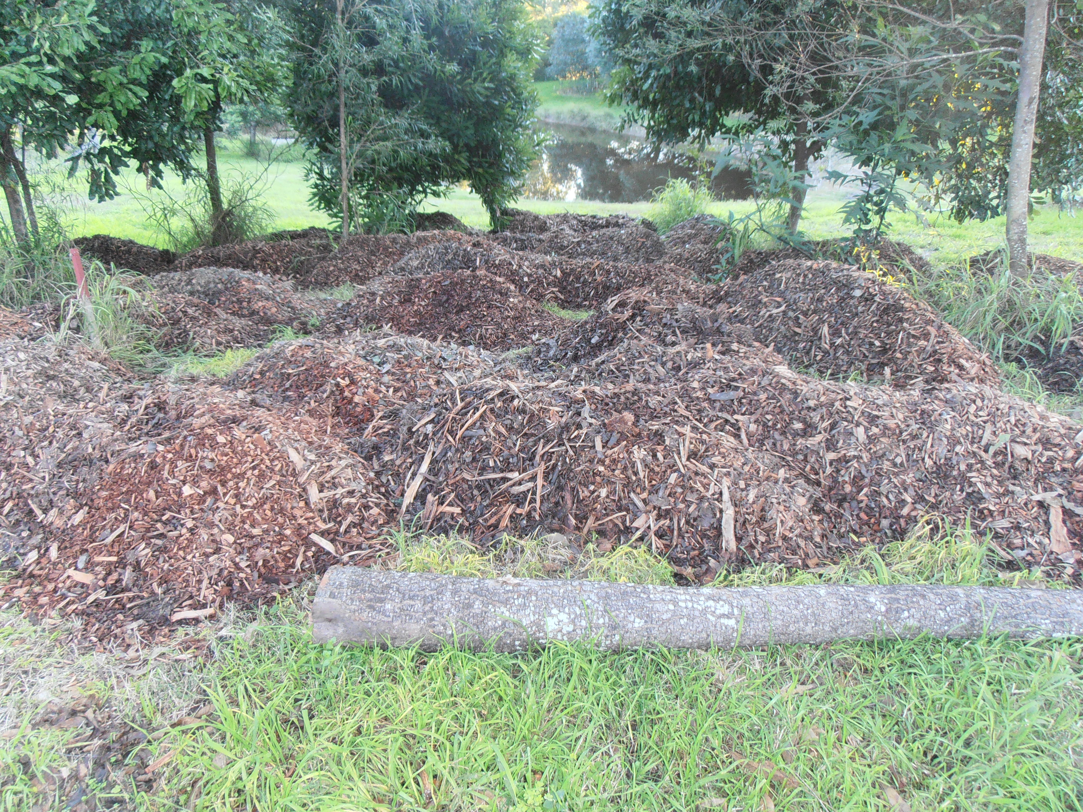 June 2012: Following the removal and processing of Cadaghis in the side paddock, Ian uses some of the mulch to create the ‘macadamia garden’ which fills in the space between several macadamias in the side paddock. He plants several natives there too.