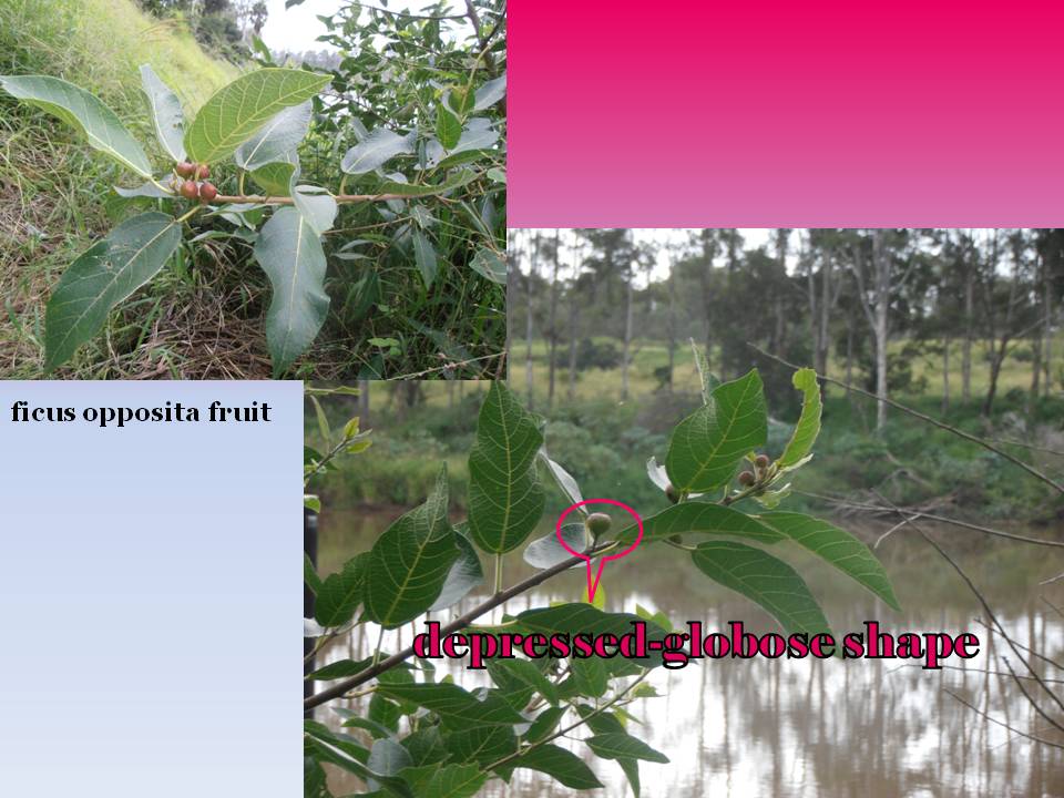 - fruit is paired in the axils of the leaves and most have a depressed-globose shape as in common greengrocer figs (TRB)