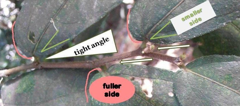 In keeping with this tendency – for the Ficus coronata leaves to fan out in a horizontal plane at the end of their branches – it is usual for the leaves to be asymmetric at the base. As can be seen in the above photo, the side of the leaf next to the branch is smaller than the opposite side.