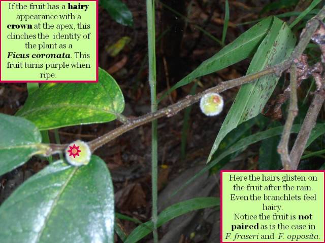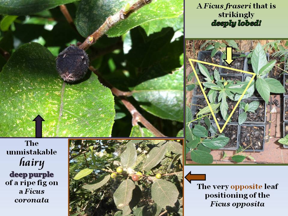 The following summary of the different characteristics of the sandpaper figs is only intended to be a guide to NOVICES who are trying to label the sandpaper figs that occur in their own gardens. We can still find it difficult to distinguish between the sandpaper figs especially when they are young or their fruit is not in season. The fruit occurs on Ficus coronata from January to June, but on Ficus fraseri from June to November. There can be fruit on the Ficus opposita most of the year.There can also be differences in the shape, size and texture of leaves from the same plant. Our advice if you are still unable to identify is to WAIT until the plant is older or it is a different season.