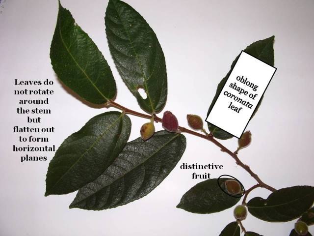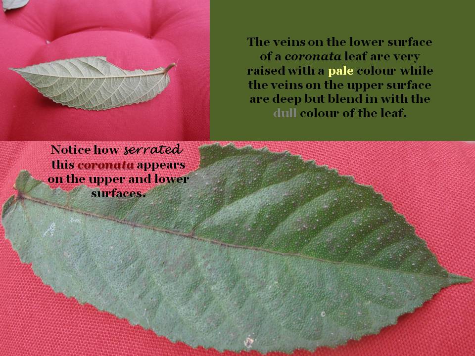 The following is a summary that can be printed into a useful guide for walking through your own garden. It begins with the most obvious steps for identification. Please note that it may not be enough to use only one feature (e.g. the edge of the leaf) to positively identify a plant. For instance the experts Williams, Harden & McDonald in Trees and Shrubs in Rainforest of New South Wales and southern Queensland 1984, on page 101, point out that the margins of F. coronatas may be ‘entire, toothed or crenulate’ and that the margins on the leaves of F. fraseri are ‘entire or shallowly-toothed’ and on the F. opposita they are ‘entire to toothed or often sinuate(wavy)’. Take your pick! but at our place we inevitably find that F. coronatas have serrations as Graeme Wilson claims!