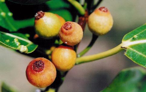 - paired roundish fruit which is a rough yellow fruit turning red/black (LFW)