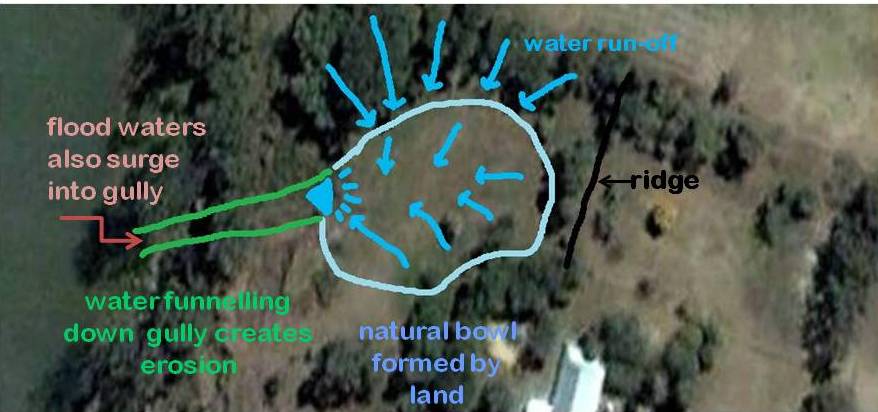 Although the next diagram is simplistic it shows the basic problem of erosion that had developed in the side paddock where the run-0ff after rain was so strong – the neighbour’s property to the north is higher was well as the ridge inside the paddock – that it had created a deep gully leading down to the river. This in turn became a natural inlet to flood waters and as the water subsided it dragged away even more soil.