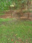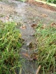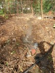 - Placed branches and other loose vegetation horizontal to the water flow to slow down the water and disperse it over a wider area so that it stopped channelling out a deep ditch. (Mulch was also spread out but this was not sufficient in itself to prevent erosion.)